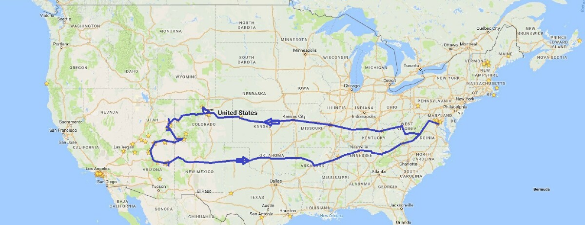 THEY DROVE THROUGH VIRGINIA,WEST VIRGINIA, OHIO,KENTURKY,INDIANA,ILLINOIS,MISSOURI,KANSAS,COLORADO,UTAH,NEW MEXICO,ARIZONA,TEXAS,OKLAHOMA,ARKANSAS,TENNESSEE.